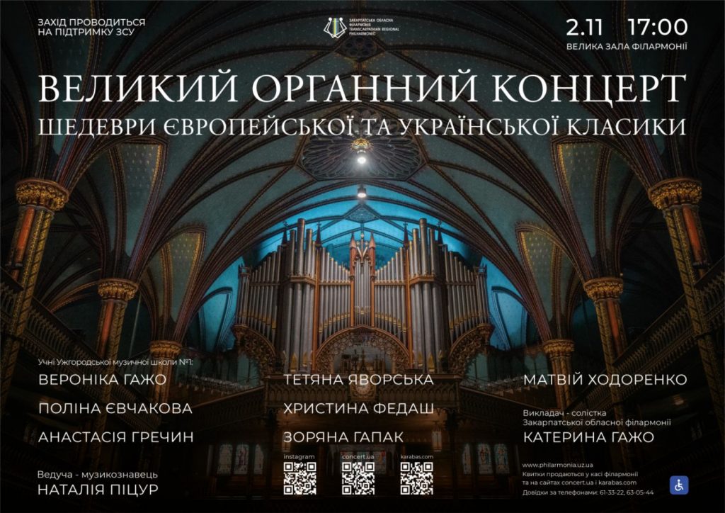 «Великий органний концерт» для слухачів готують учні органного класу Ужгородської музичної школи №1 – Вероніка Гажо, Анастасія Гриневич, Поліна Євчакова, Зоряна Гапак, Христина Федаш, Тетяна Яворська та Матвій Ходоренко під керівництвом викладачки, солістки Закарпатської філармонії Катерини Гажо.