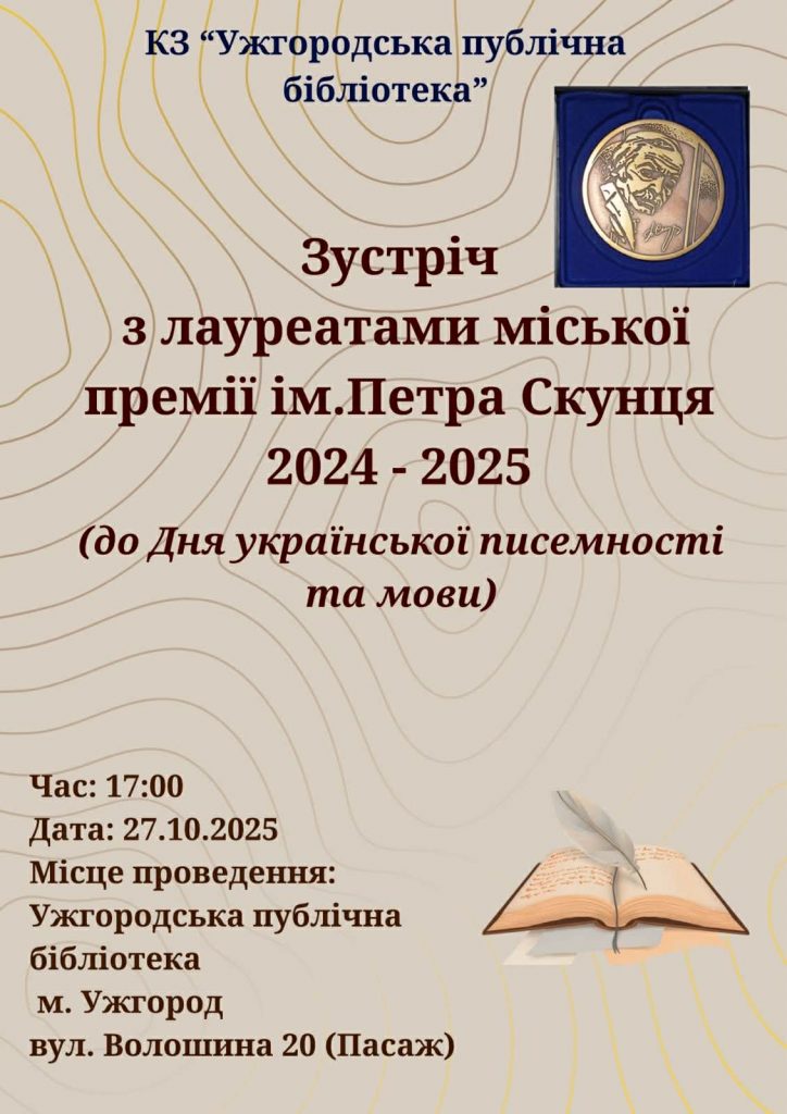 У понеділок, 27 жовтня, з нагоди Дня української писемності та мови в Ужгородській публічній бібліотеці відбудеться творча зустріч із лауреатами Ужгородської міської премії імені Петра Скунця.