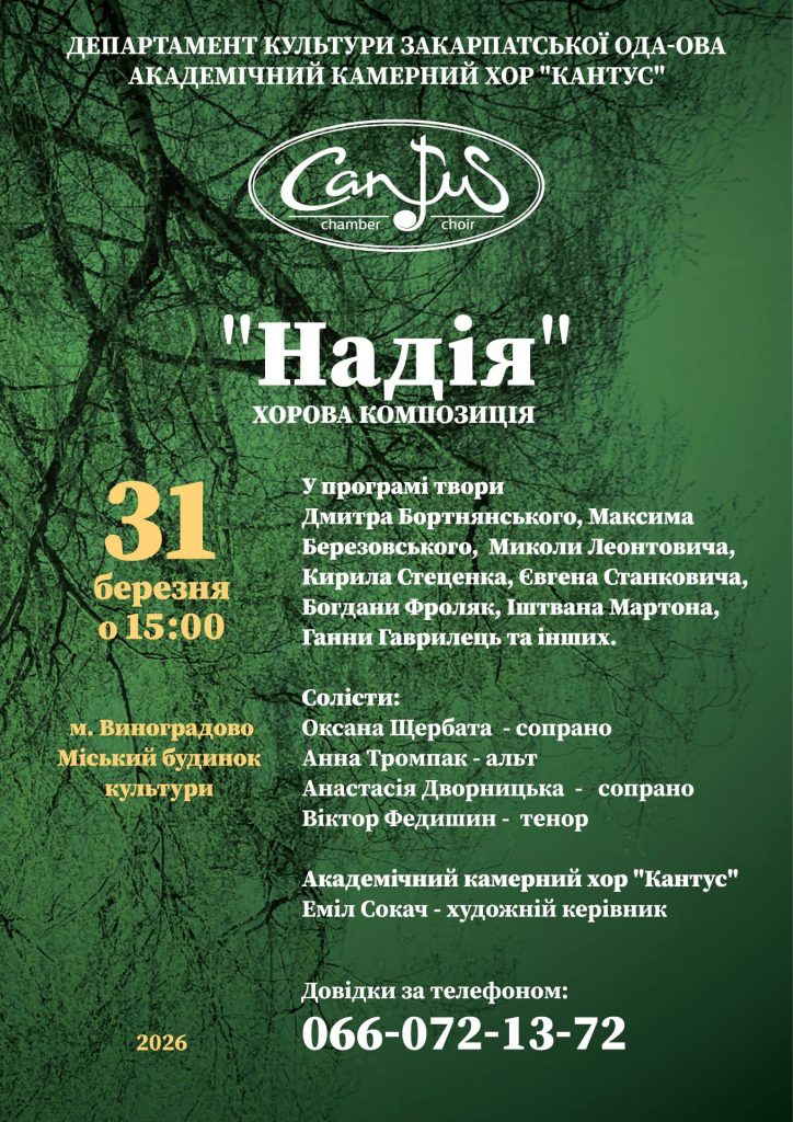 У вівторок, 31 березня, Академічний камерний хор «Кантус» завітає з концертом до м.Виноградів.