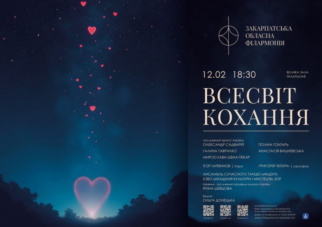 «Всесвіт кохання» – вечір музики з такою назвою відбудеться у Закарпатській обласній філармонії до Дня закоханих.