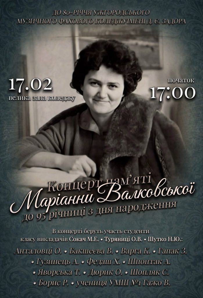У вівторок, 17 лютого, у великій залі Ужгородського музичного фахового коледжу ім.Д.Є.Задора відбудеться концерт пам’яті Маріанни Валковської – до 95-річчя з дня народження.