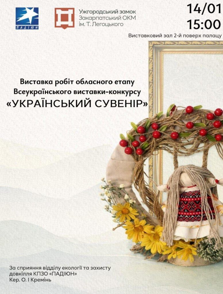 У середу, 14 січня, в Закарпатському обласному краєзнавчому музеї ім.Т.Легоцького представлять роботи обласного етапу Всеукраїнської виставки-конкурсу «Український сувенір» (за сприяння відділу екології та захисту довкілля КЗПО «ПАДІЮН»).