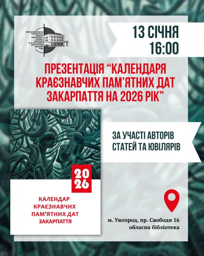 У вівторок, 13 січня, в Закарпатській обласній універсальній науковій бібліотеці ім.Ф.Потушняка презентують «Календар краєзнавчих пам’ятних дат Закарпаття на 2026 рік».