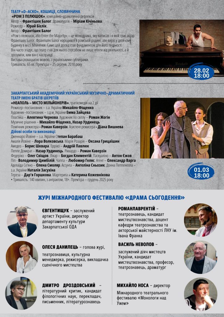 На сцені Закарпатського академічного обласного українського музично-драматичного театру ім.братів Ю.-А. та Є.Шерегіїв своє мистецтво представлятимуть провідні театри України – з Дніпра, Львова, Івано-Франківська й Ужгорода. Кожна з пропонованих вистав по-своєму відповідає на виклики сучасності, переосмислює класику та відкриває нові сенси.