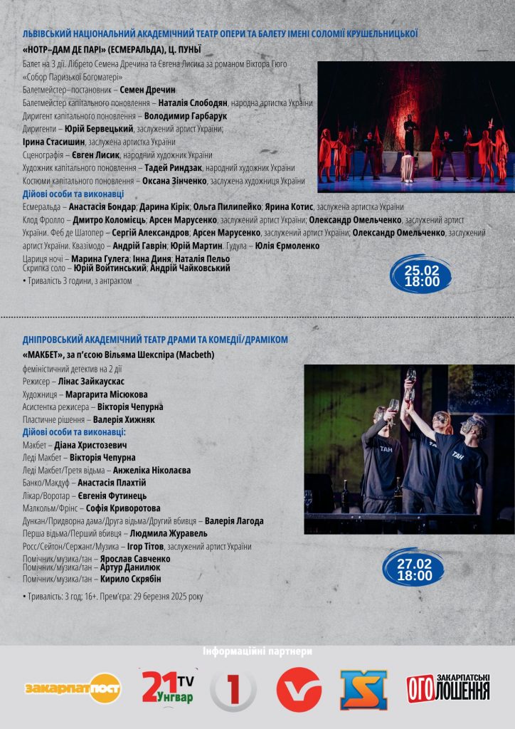 – 25 лютого – балет на 3 дії «Нотр-Дам де Парі» («Есмеральда») від Львівського національного академічного театру опери та балету ім.Соломії Крушельницької;