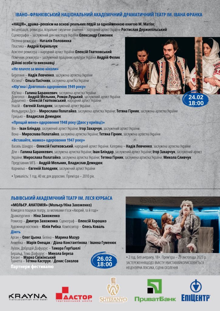 – 24 лютого – драма-реквієм на основі реальних подій «Нація» від Івано-Франківського національного академічного драматичного театру ім.Івана Франка;