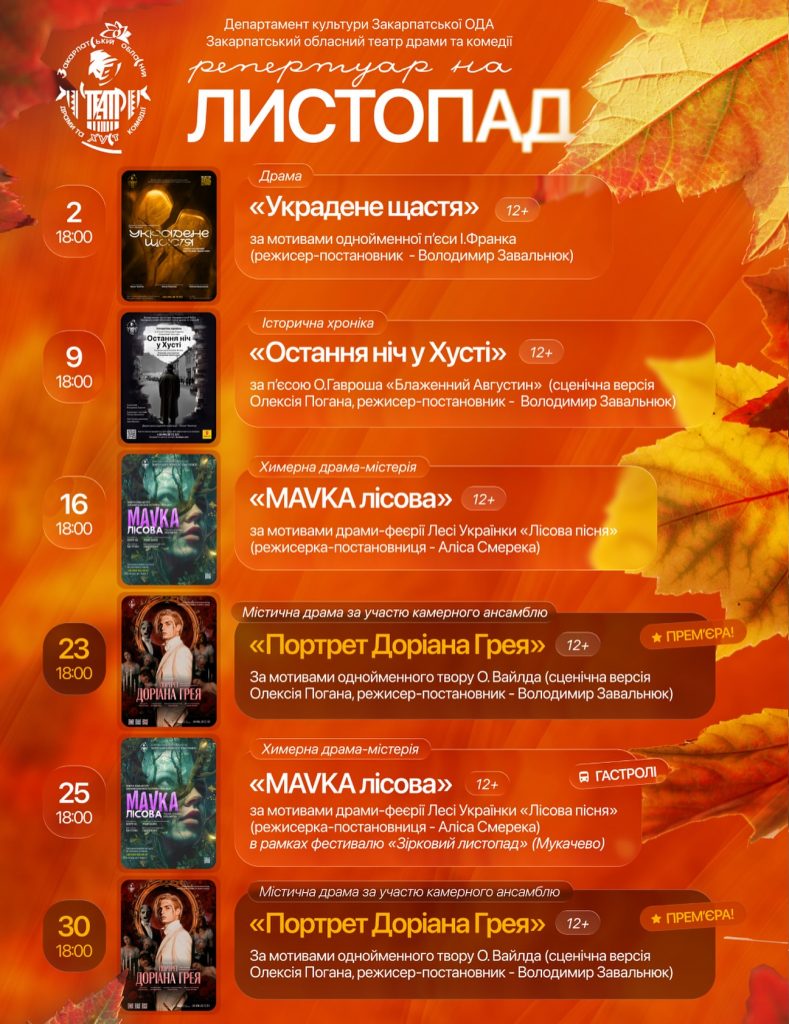 Закарпатський обласний театр драми та комедії (м.Хуст) анонсує покази драми «Украдене щастя», історичної хроніки «Остання ніч у Хусті», а ще химерної драми-містерії «MAVKA лісова», з якою колектив завітає і до Мукачева – 25 листопада.