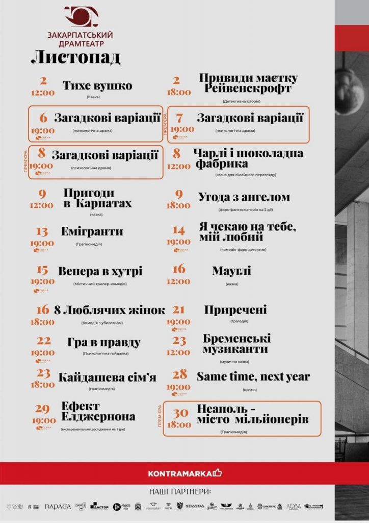 Закарпатський академічний обласний театр ляльок цього місяця тішитиме маленьких і юних глядачів та їхніх батьків виставами «Дід Кузьма та юрба», «Одарчині іменини», «Пригоди Кожика і Летика», «Про Валибука, принцесу Небійся та Довгоборода», «Підкова на щастя», «Фабрика ниток», «Котик і півник», «Принцеса на горошині», «Чок та його вірні друзі», «Козак Мамарига». Покази – щосуботи та щонеділі об 11:00 та о 13:00.