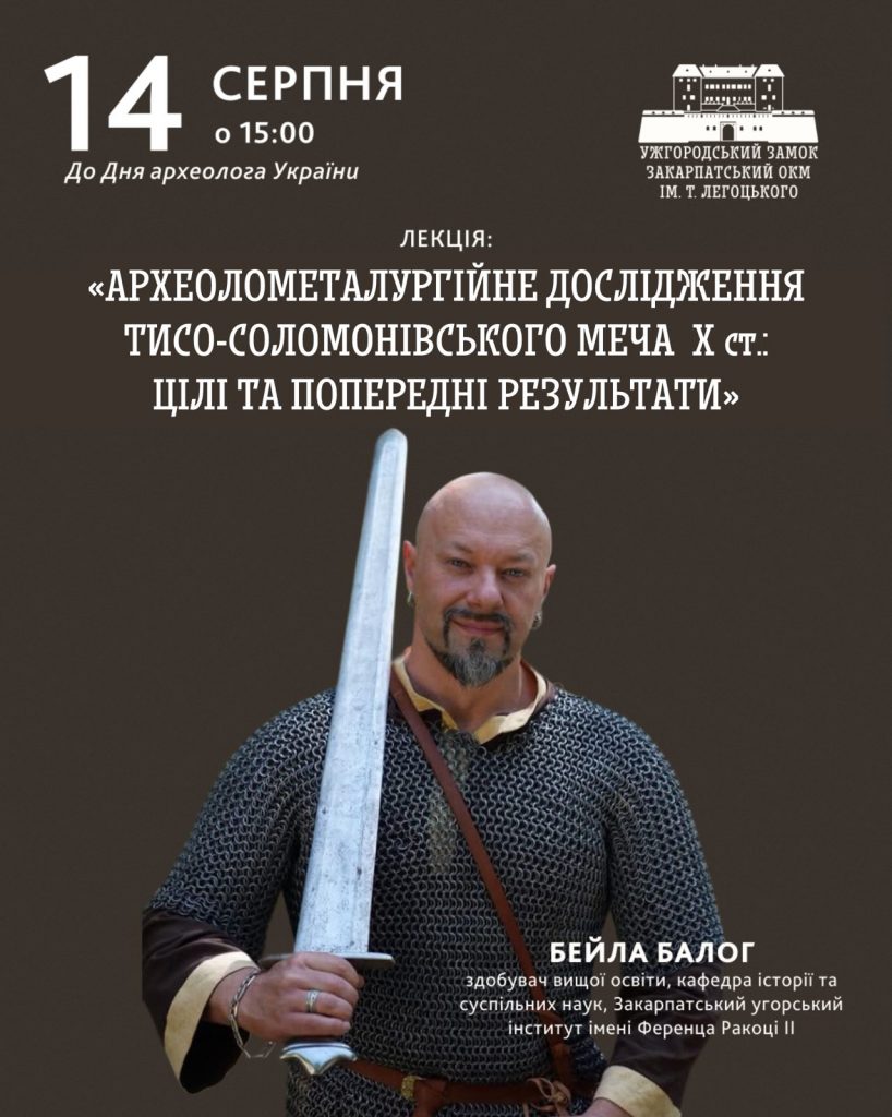 – у четвер, 14 серпня – лекцію «Археолометалургійне дослідження Тисо-Соломонівського меча X ст.: цілі та попередні результати» від Бейли Балога – здобувача освіти кафедри історії та суспільних дисциплін Закарпатського угорського інституту імені Ференца Ракоці ІІ. Початок о 15:00.