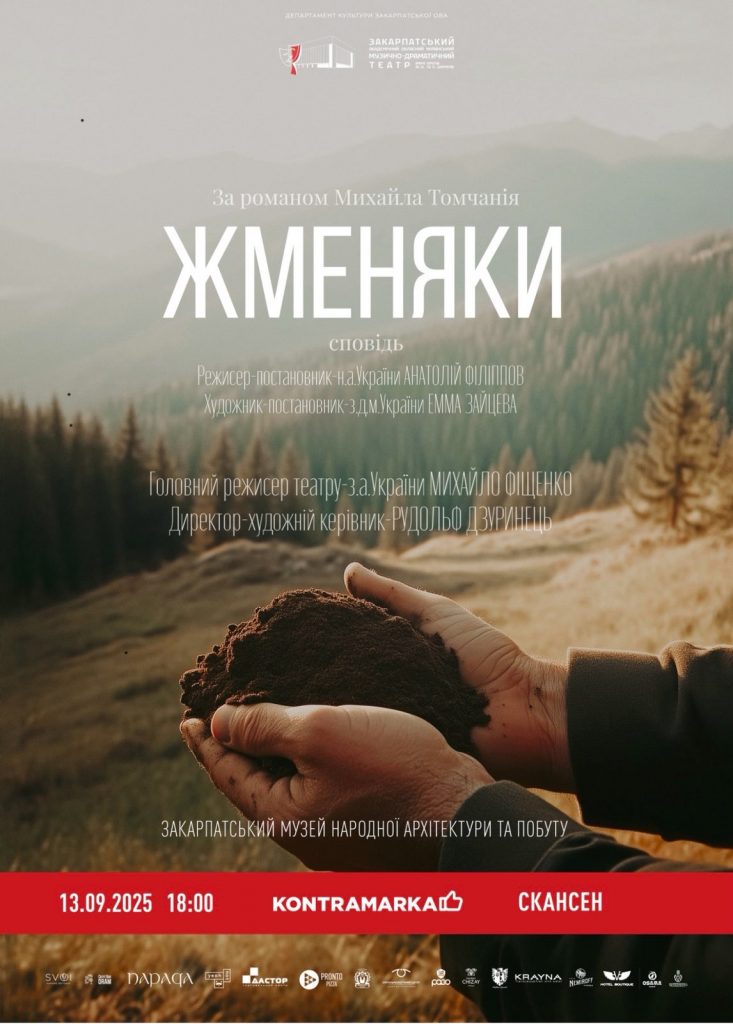 У суботу, 13 вересня, на території Ужгородського скансену (Закарпатський музей народної архітектури та побуту) охочі матимуть нагоду переглянути виставу «Жменяки» від Закарпатського академічного обласного українського музично-драматичного театру ім.братів Ю.-А. та Є.Шерегіїв.