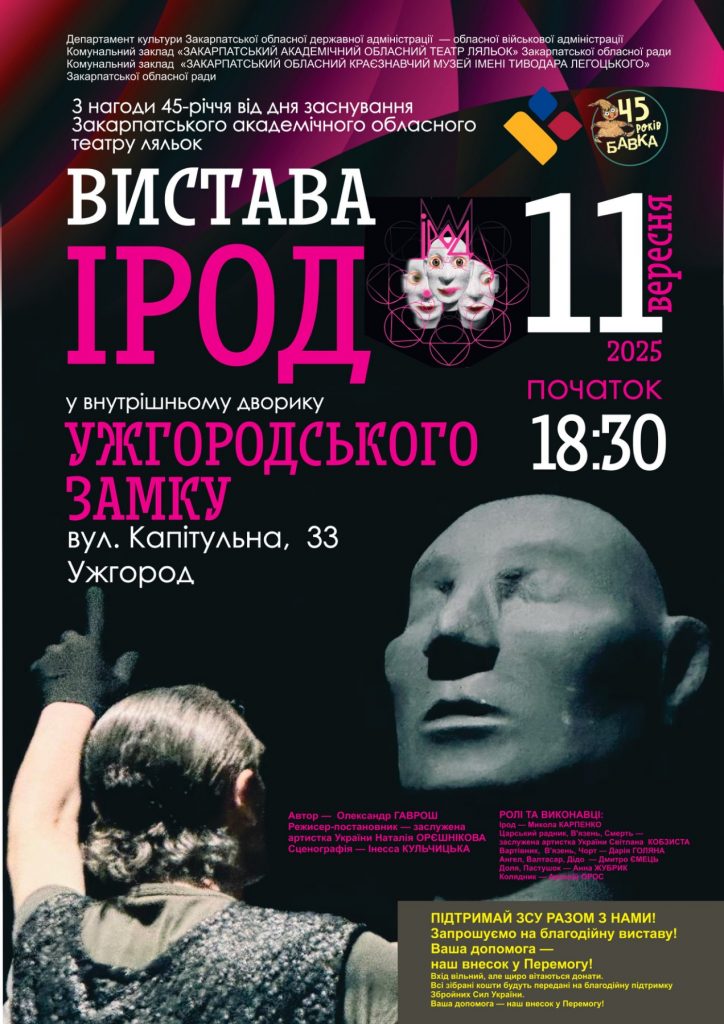 У четвер, 11 вересня, Закарпатський академічний обласний театр ляльок представить у внутрішньому дворику Ужгородського замку (Закарпатський обласний краєзнавчий музей ім.Т.Легоцького) виставу «Ірод» за п’єсою сучасного закарпатського драматурга Олександра Гавроша.