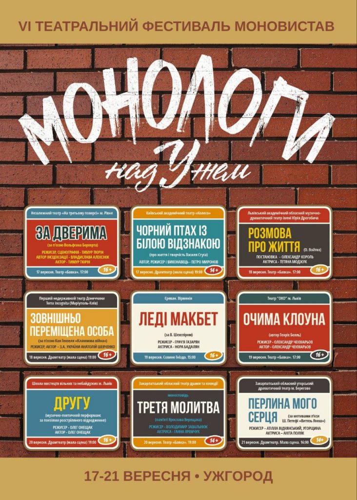 «Монологи над Ужем» проводять уже вшосте. За цей час у межах фестивалю було представлено більше 40 вистав від вітчизняних театрів та 15 – від колективів із різних країн Європи.