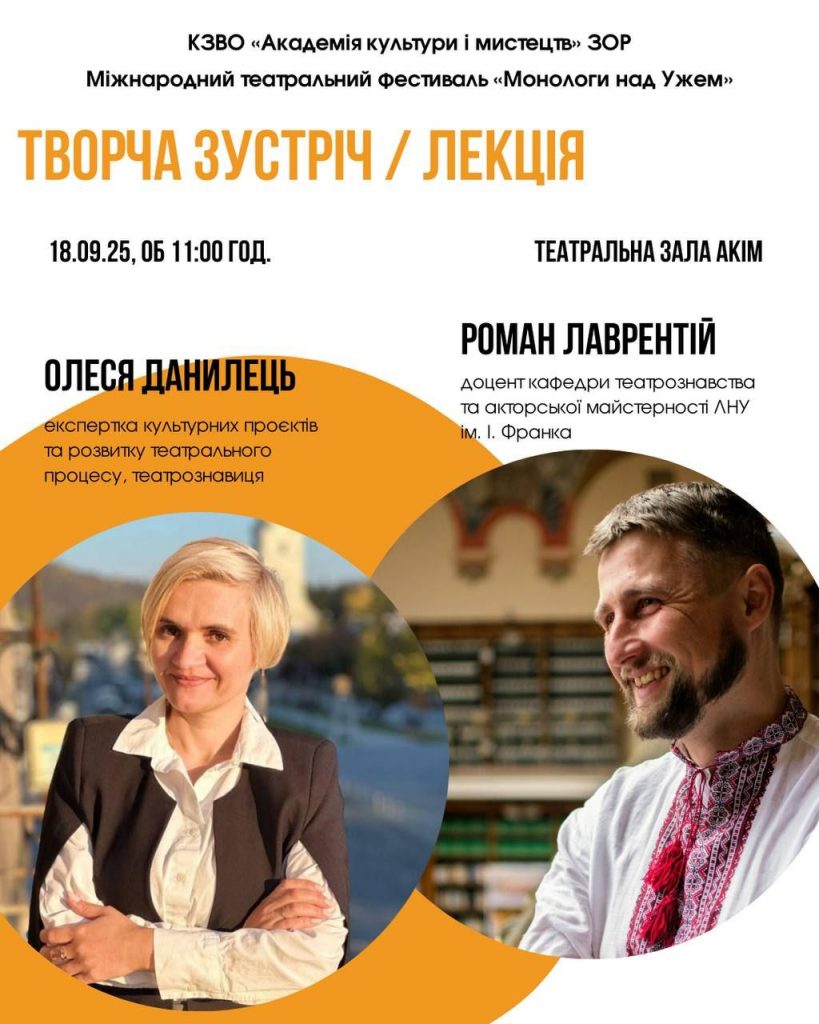 Уже завтра, 18 вересня, об 11:00 на студентів чекає лекція від доцента кафедри театрознавства та акторської майстерності Львівського національного університету ім.І.Франка Романа Лаврентія «Лесь Курбас і його однодумці», а також розмова з експерткою із культурно-мистецьких проєктів та розвитку театрального процесу, театрознавицею Олесею Данилець.