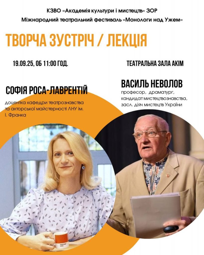 А в пʼятницю, 19 вересня, об 11:00 до вишу завітає театрознавець Василь Неволов, а доцента кафедри театрознавства та акторської майстерності ЛНУ ім.І.Франка Софія Роса-Лаврентій прочитає тематичну лекцію «Європейський театральний авангард».