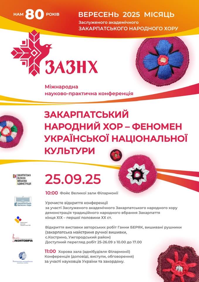У четвер, 25 вересня, саме в день створення колективу, о 10:00 у фоє Закарпатської обласної філармонії розпочне роботу Міжнародна науково-практична конференція «Закарпатський народний хор – феномен української національної культури». Під час відкриття цього непересічного заходу хор виконає кілька пісень в обробці Миколи Попенка, а артисти балету візьмуть участь у демонстрації традиційного народного вбрання Закарпаття кінця ХІХ-першої половини ХХ ст. Одночасно там розміститься виставка вишиваних рушників майстрині Ганни Беряк з с.Кострино Ужгородського району.