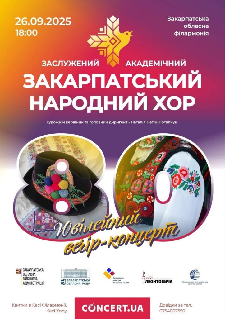 Нагадаємо, 26 вересня на сцені Закарпатської обласної філармонії відбудеться урочистий концерт із нагоди 80-річчя Заслуженого академічного Закарпатського народного хору. Початок о 18:00.