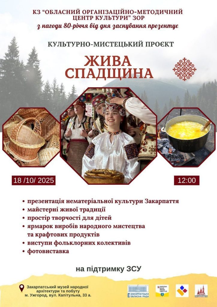 Захід «Жива спадщина» проводить Закарпатський обласний організаційно-методичний центр культури, залучивши учасників із різних територіальних громад краю, які представлять свої традиції, зокрема, ті, що входять до Національного та Регіонального переліків елементів нематеріальної культурної спадщини.