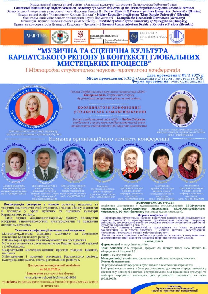 5 листопада Академія культури і мистецтв проводитиме І Міжнародну студентську науково-практичну конференцію «Музична та сценічна культура Карпатського регіону в контексті глобальних мистецьких процесів».
