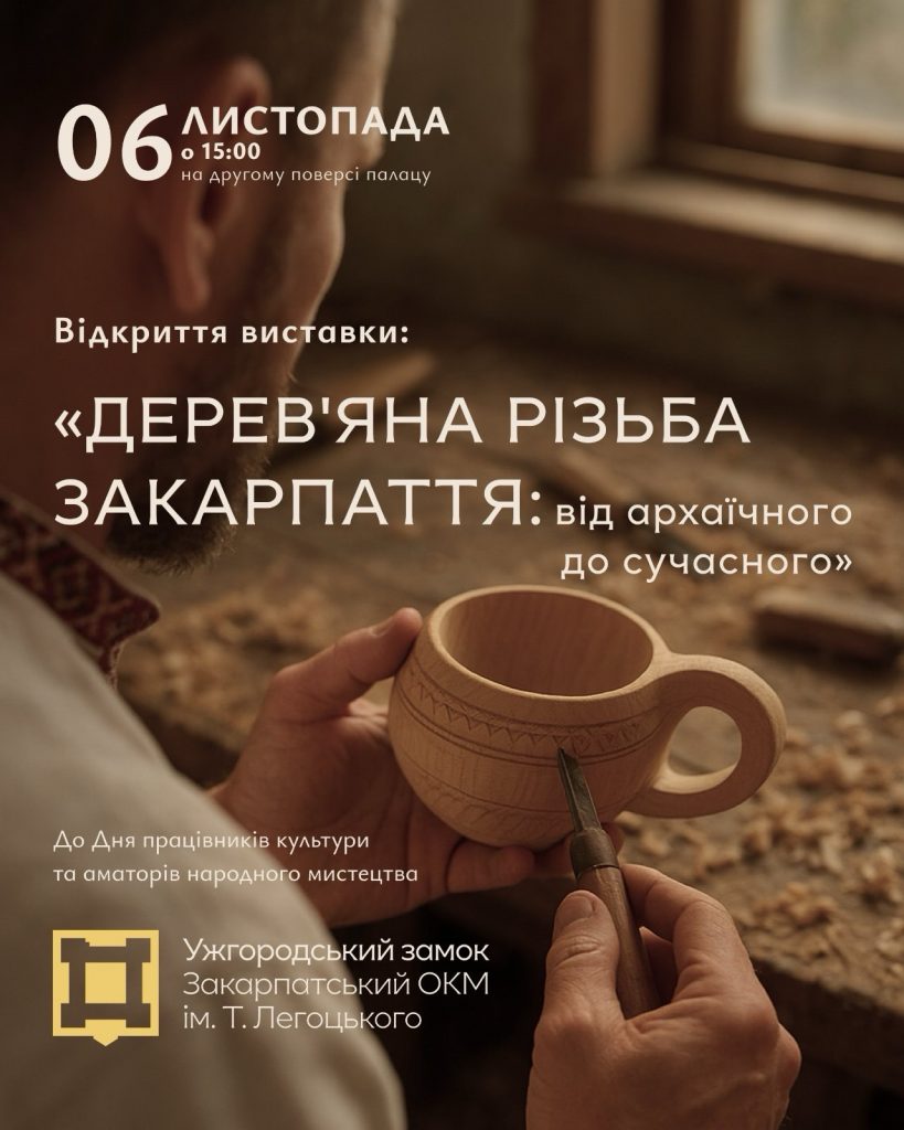 – 6 листопада о 15:00 – відкриття виставки «Дерев’яна різьба Закарпаття: від архаїчного до сучасного» (другий поверх).