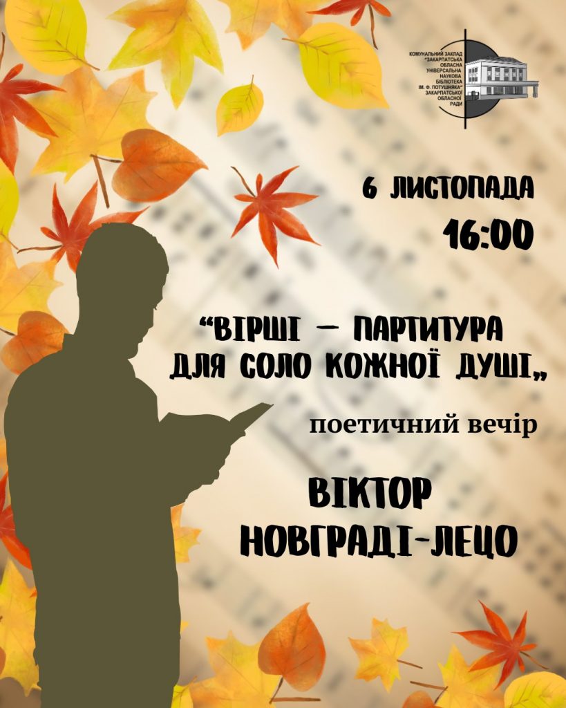 – 6 листопада о 16:00 – поетичний вечір «Вірші – партитура для соло кожної душі» – співробітника книгозбірні, літератора, а нині військовослужбовця Віктора Новграді-Лецо.