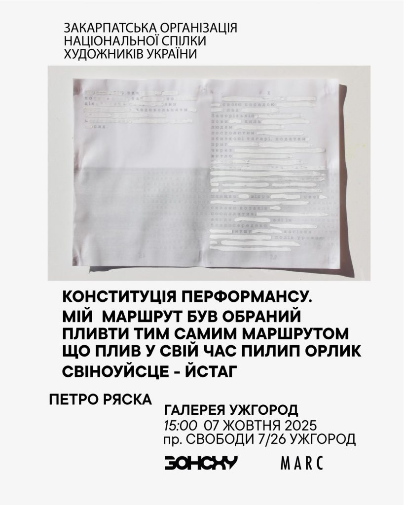 – 7 листопада о 15:00 – відкриття виставки «Конституція перформансу. Мій маршрут був обраний пливти тим самим маршрутом що плив у свій час Пилип Орлик Свіноуйсце – Йстаг» – живописця, перформера, куратора Петра Ряски (галерея «Ужгород»).