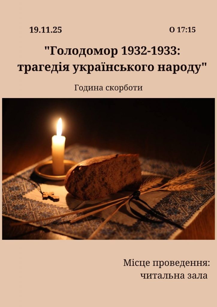19 листопада о 17:15 – година скорботи «Голодомор 1932-1933 років: трагедія українського народу», проводить викладачка вишу, кандидат історичних наук Галина Біланич (читальна зала).