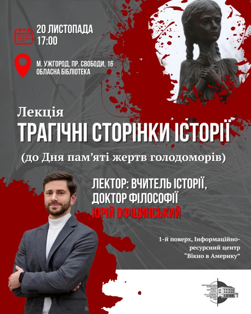 20 листопада о 17:00 – лекція «Трагічні сторінки історії» від учителя історії, доктора філософії Юрія Офіцинського; книжкова виставка «Незламний дух нескореної нації».