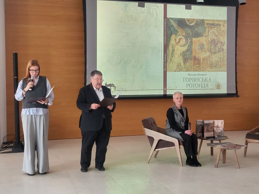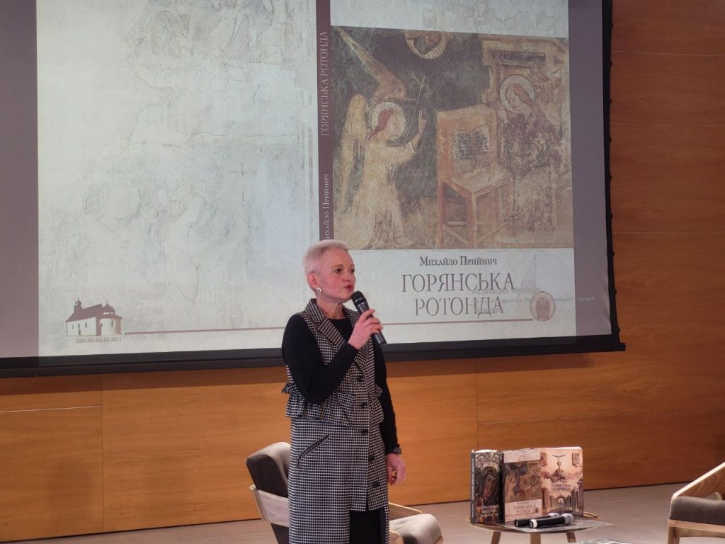 Представила автора праці проректорка ЗАМ, кандидат мистецтвознавства Оксана Гаврош. Зауважила, що тема сакрального мистецтва займає важливе місце в науковому доробку Михайла Приймича – їй він присвятив ось уже шосту ґрунтовну працю. Мовлячи про нове видання, Оксана Гаврош зазначила: незважаючи на те, що пам’ятці понад 7 століть, досі залишалося чимало питань, які потребували уточнення, і завдяки дослідженню Михайла Приймича – вони є в цій книзі, разом із цікавим трактуванням унікального живопису. Наразі це – найповніше з культурологічних видань про Горянську ротонду.