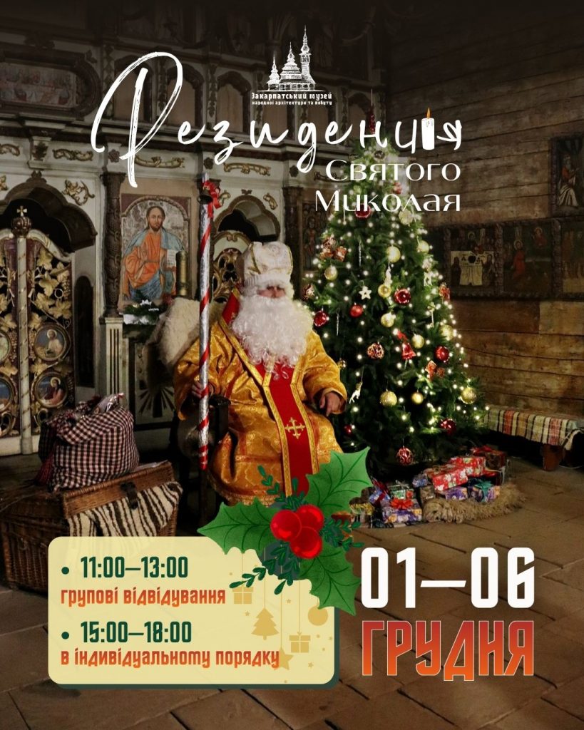 1-6 грудня – Резиденція Св.Миколая в Ужгородському скансені (за попереднім записом): 11:00-13:00 – для колективних відвідувань (дитсадки, школи), 15:00-18:00 – для індивідуальних відвідувань (діти в супроводі дорослих).