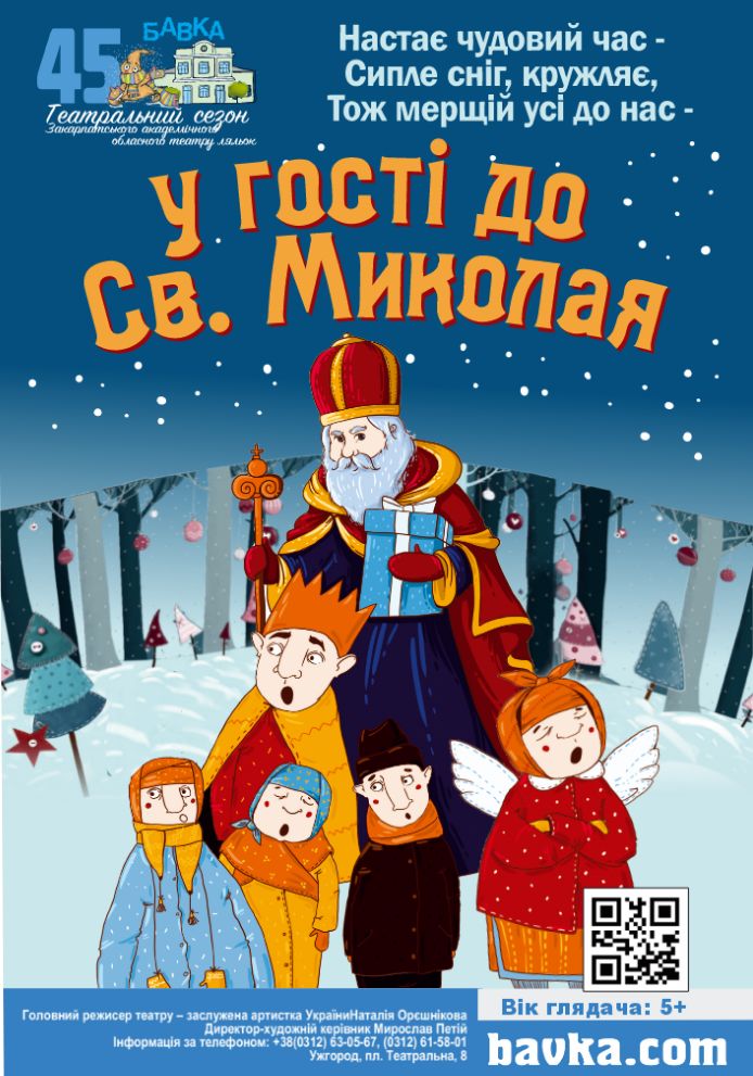 6 і 7 грудня об 11:00 та о 13:00 – покази вистави «У гості до Св.Миколая» у постановці головної режисерки театру, заслуженої артистки України Наталії Орєшнікової.