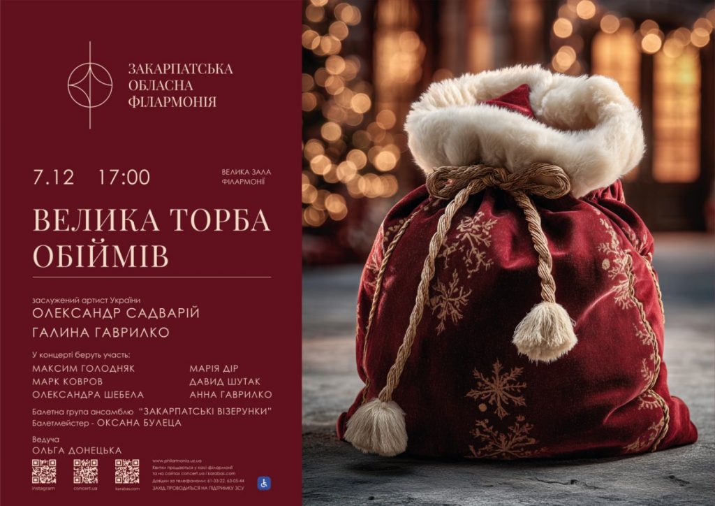 7 грудня о 17:00 – концерт «Велика торба обіймів» від заслуженого артиста України Олександра Садварія та Галини Гаврилко, за участі талановитих виконавців Марії Дір, Давида Шутака, Анни Гаврилко, Олександри Шебели, Марка Коврова і Максима Голодняка, а також балетної групи ансамблю «Закарпатські візерунки» під керівництвом балетмейстерки Оксани Булеци.