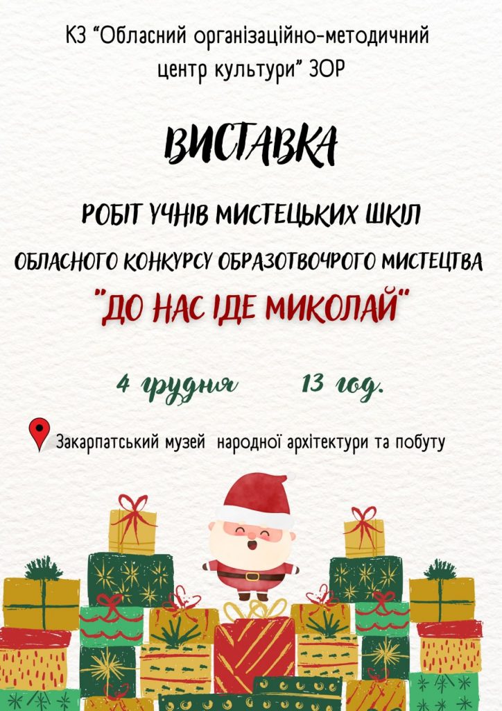 4 грудня об 11:00 – відкриття обласної виставки-конкурсу дитячого малюнка учнів мистецьких шкіл Закарпаття «До нас іде Миколай» (у залі Закарпатського музею народної архітектури та побуту).