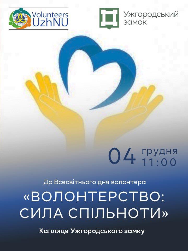 У четвер, 4 грудня, в каплиці Ужгородського замку відбудеться захід «Волонтери: спільнота сили», що стане платформою для натхнення, діалогу й обміну досвідом між тими, хто творить добро щодня. Головними спікерами стануть представники Волонтаріату Ужгородського національного університету на чолі з головою правління Крістіною Товт і їхні партнери – люди, які власним прикладом демонструють силу співпраці та взаємопідтримки.