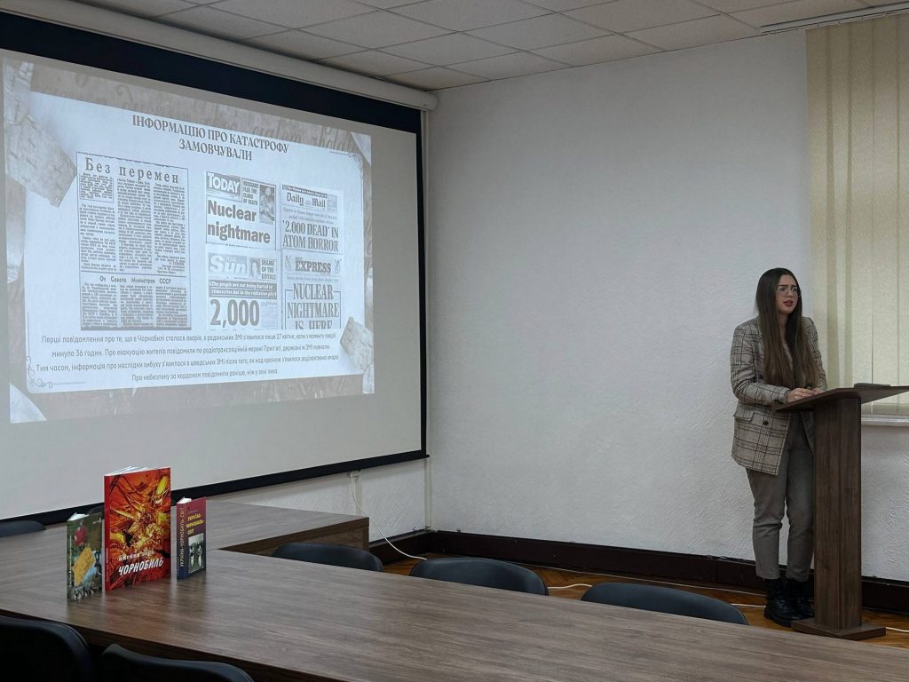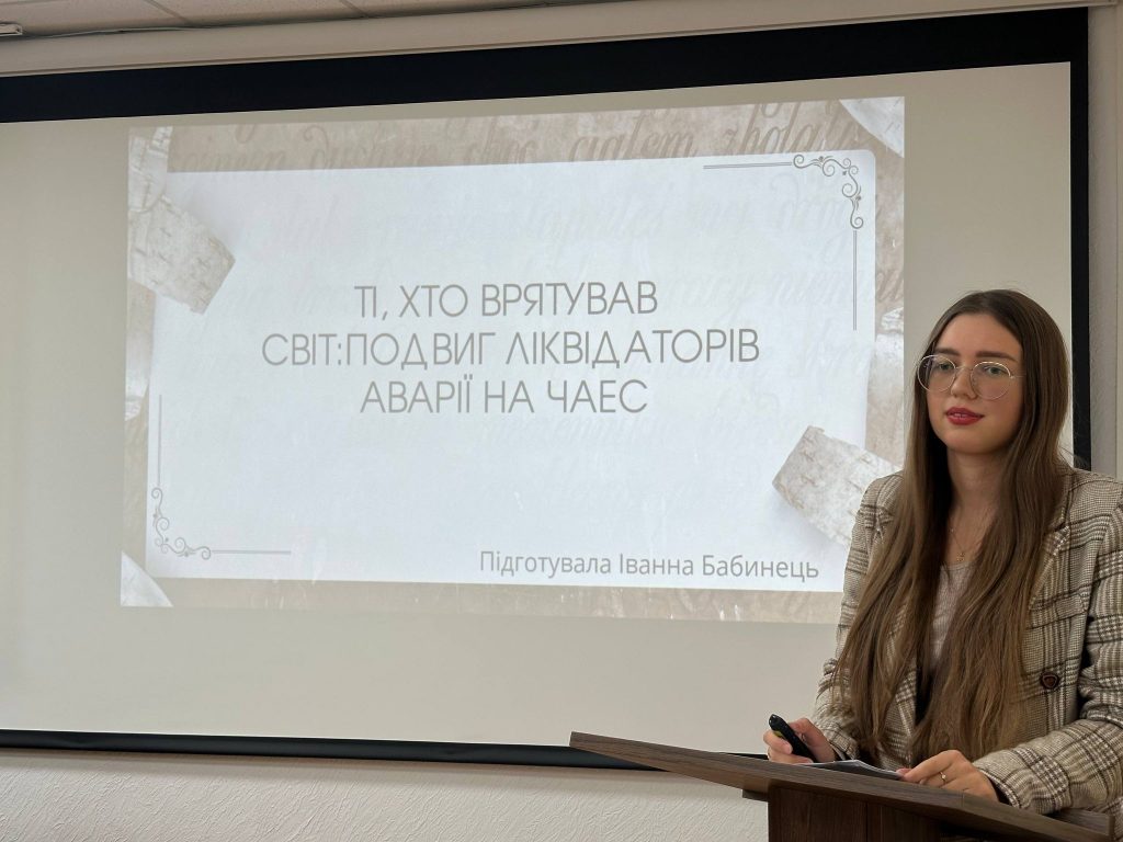 Старша наукова співробітниця відділу науково-освітньої роботи Іванна Бабинець розповіла учням про причини та наслідки найбільшої техногенної катастрофи ХХ століття, що сталася 26 квітня 1986 року внаслідок вибуху реактора четвертого енергоблока Чорнобильської АЕС. Потужність викиду була співмірною з дією близько 300 атомних бомб, скинутих на Хіросіму в 1945 році. Аварія повністю зруйнувала атомний реактор, спричинила значний вихід радіоактивних речовин у навколишнє середовище, а утворена радіоактивна хмара поширилася на великі території колишнього СРСР.