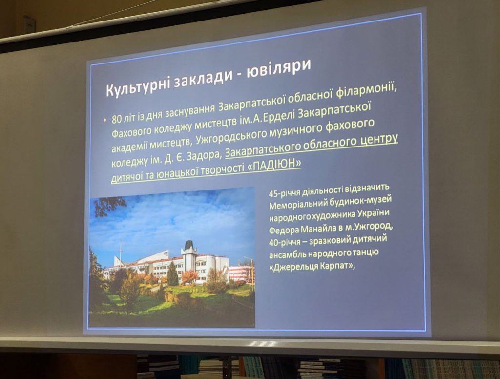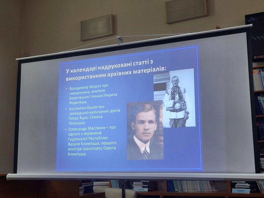 Привітала гостей бібліотеки директорка Олена Канюка. Вона нагадала, що календар у книгозбірні видають із 1964 року. За час існування щорічник змінював свій формат, розширювався та вдосконалювався. Проте незмінним залишається його основне призначення – знайомити читачів зі знаменними і пам’ятними датами, які відзначатимуть упродовж року Закарпаття, Україна та світ.
