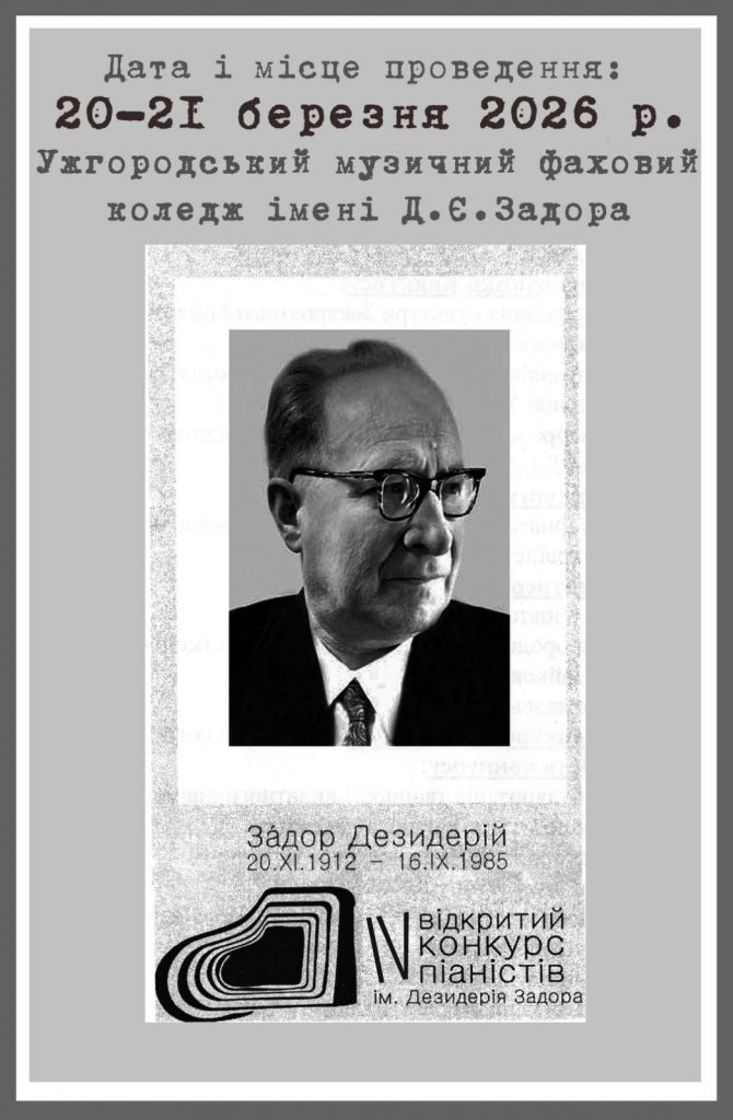 Ужгородський музичний фаховий коледж ім.Д.Є.Задора приймає заявки на участь у ІV відкритому конкурсі піаністів імені Дезидерія Задора.