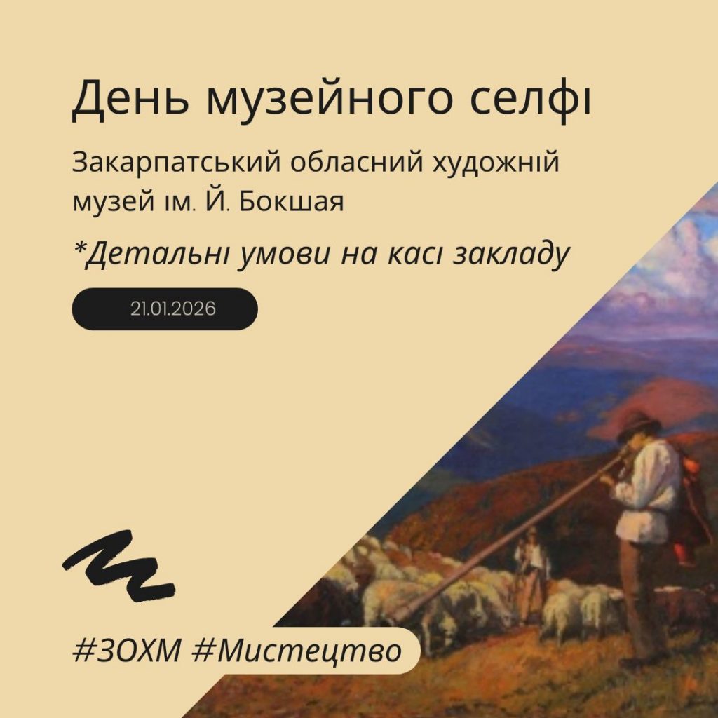 Закарпатський обласний художній музей ім.Й.Бокшая з 9:00 до 17:00 чекатиме відвідувачів, охочих зробити селфі з улюбленим твором мистецтва з експозиції закладу. Відтак фото слід опублікувати в соцмережах із відповідними гештеґами: #ЗОХМ, #Мистецтво. Автори світлин, найбільш уподобаних користувачами, отримають особливе запрошення від музею.