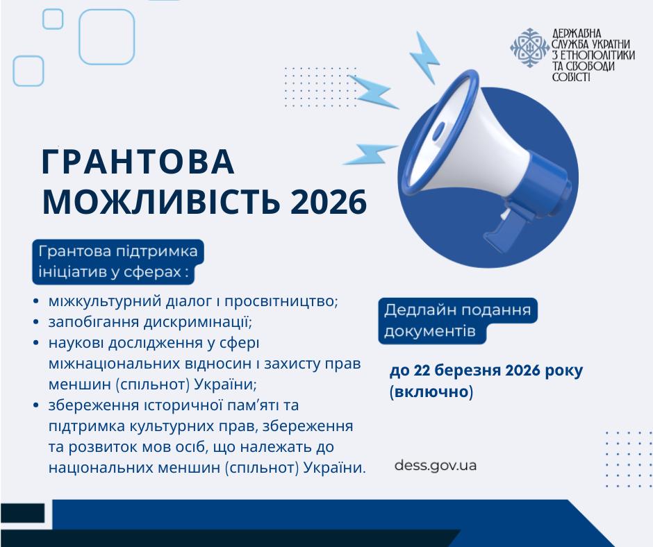 Державна служба України з етнополітики та свободи совісті (ДЕСС) оголосила конкурс для громадських об’єднань національних меншин (спільнот), який надасть можливість отримати державне фінансування на реалізацію проєктів у 2026 році.