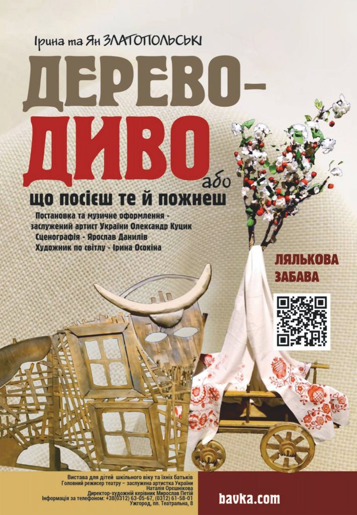31 січня об 11:00 та о 13:00 – покази вистави-лялькової забави «Дерево-диво» Ірини та Яна Златопольських у режисерському втіленні заслуженого артиста України Олександра Куцика;