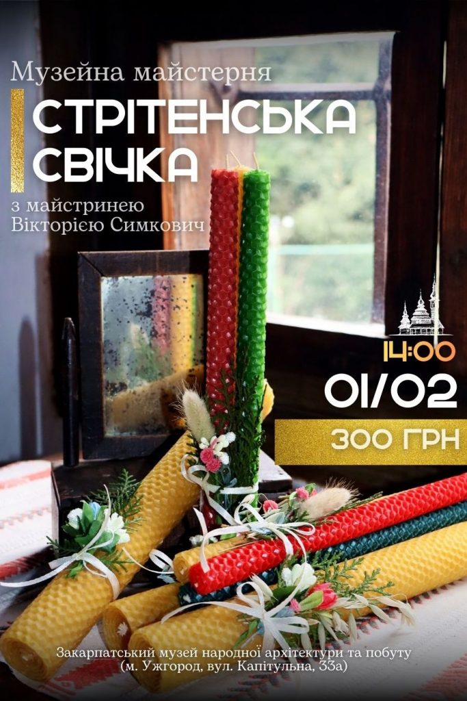 1 лютого о 14:00 – тематичне заняття «Стрітенська свічка», під час якого завідувачка відділу експозиції та науково-дослідної роботи музею Вікторія Симкович розповість про Стрітенську свічнку як традиційний охоронний атрибут і допоможе виготовити два види громничної свічки – класичну та потрійну.