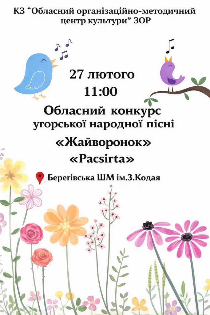 З метою реалізації творчого потенціалу юних обдарувань, сприяння розвитку національно-культурної самобутності національних спільнот Закарпаття, збагачення культурного різноманіття України департамент культури Закарпатської облдержадміністрації оголошує про проведення Обласного конкурсу угорської народної пісні «Жайворонок» («Pacsirta») в 2026 році.