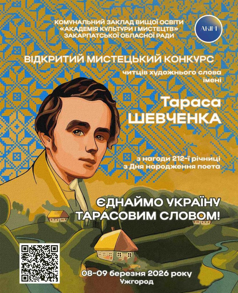 Академія культури і мистецтв пропонує охочим долучитися до Відкритого мистецького конкурсу читців художнього слова імені Тараса Шевченка «Єднаймо Україну Тарасовим словом!», який відбудеться 8-9 березня.