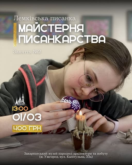 1 березня о 13:00 – друге заняття у музейній Майстерні писанкарства. Разом із головою Закарпатського обласного осередку Національної спілки майстрів народного мистецтва України, заслуженою майстринею народної творчості України Людмилою Губаль охочі навчаться виготовляти традиційну лемківську писанку.