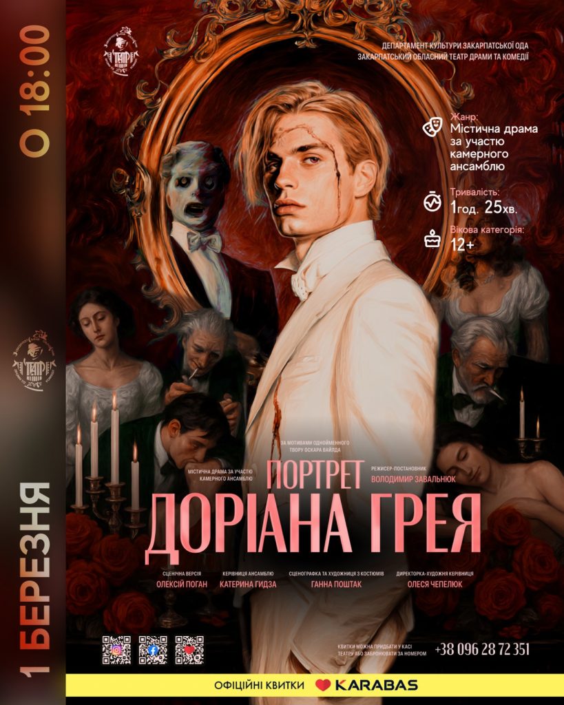1 березня о 18:00 – музична містична драма «Портрет Доріана Грея» за мотивами однойменного твору Оскара Вайльда, сценічна версія – Олексія Погана, режисер-постановник – Володимир Завальнюк.
