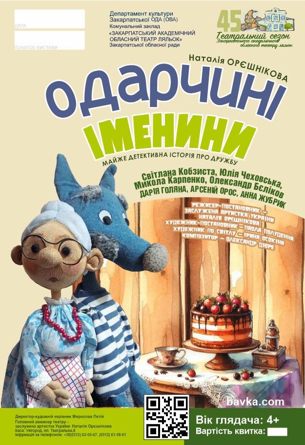 28 лютого об 11:00 та о 13:00 – покази вистави «Одарчині іменини» від головної режисерки театру, заслуженої артистки України Наталії Орєшнікової;