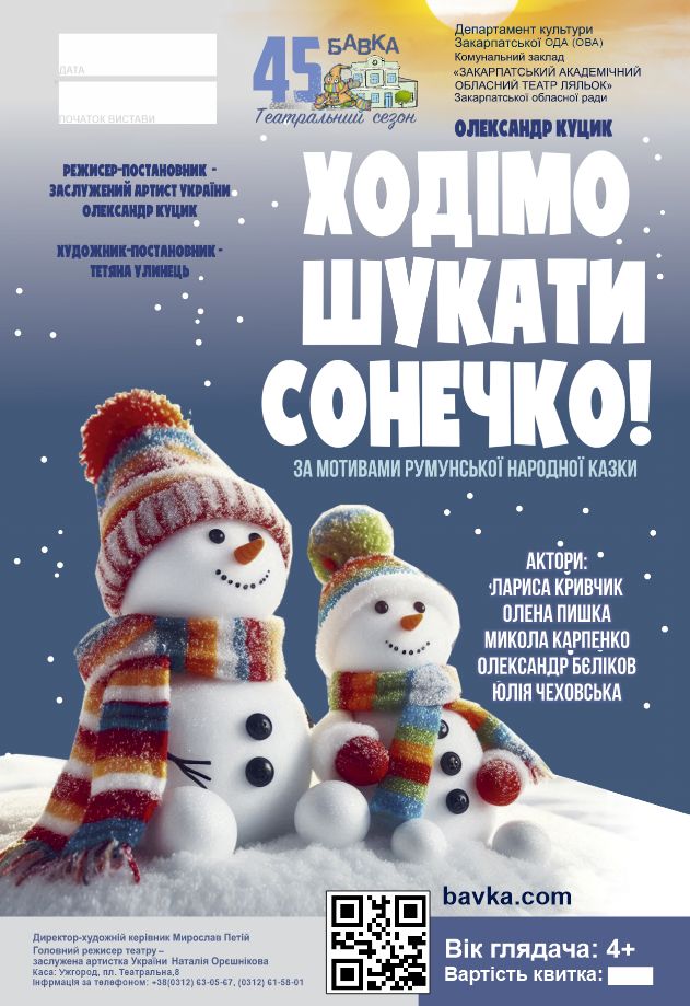 1 березня об 11:00 та о 13:00 – покази вистави «Ходімо шукати сонечко» за мотивами румунської народної казки у постановці заслуженого артиста України Олександра Куцика.
