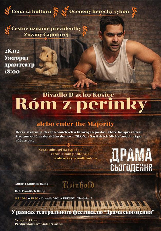 – о 18:00 – комедійно-драматична рефлексія «Рома з ковдри або Вхід у більшість» від театру Divadlo – D Ačko (м.Кошице, Словаччина), режисер – Юрай Бієлік, автор і виконавець – ромський актор, член драматичної трупи Національного театру Кошице Франтішек Балог.