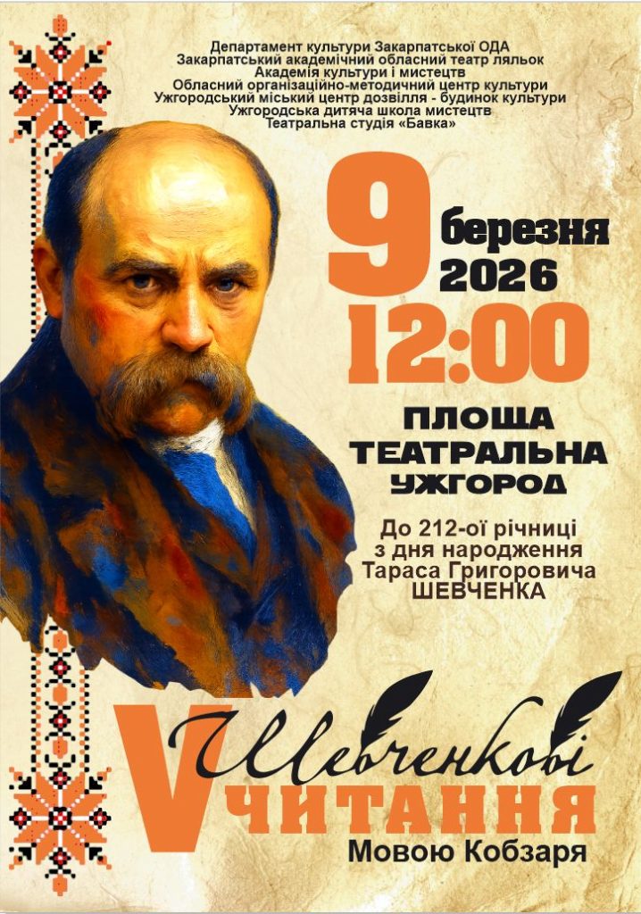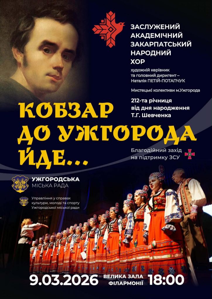 9 березня о 18:00 – концерт хору за участю мистецьких колективів області «Кобзар до Ужгорода йде» (велика зала Закарпатської обласної філармонії).