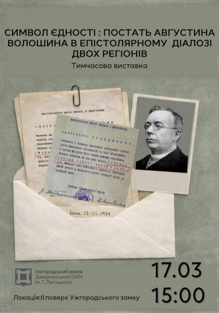 17 березня о 15:00 – відкриття тимчасової виставки «Символ єдності: постать Августина Волошина в епістолярному діалозі двох регіонів». В основі – унікальні матеріали з двох ювілейних альбомів, укладених з нагоди 50-ліття (1924 р.) та 60-ліття (1934 р.) Августина Волошина. У цих виданнях зібрано численні вітання, надіслані ювілярові особисто від громадських організацій, культурно-освітніх товариств, духовенства, освітян і представників української інтелігенції.