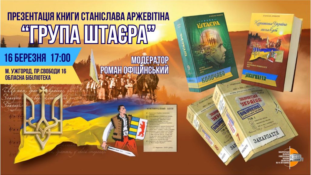 16 березня о 17:00 – презентація книги «Група Штаєра» – завершальної частини трилогії Станіслава Аржевітіна про національно-визвольний рух на Закарпатті. Попередні видання серії – «Карпатська Україна: епоха в добі» й «Закарпатська Україна: викорінення Карпатської України». У новій книзі висвітлено події в с.Колочава та його околицях, а саме – діяльність групи українських повстанців під проводом Михайла Штаєра. Модератор заходу – доктор історичних наук, професор Роман Офіцинський.